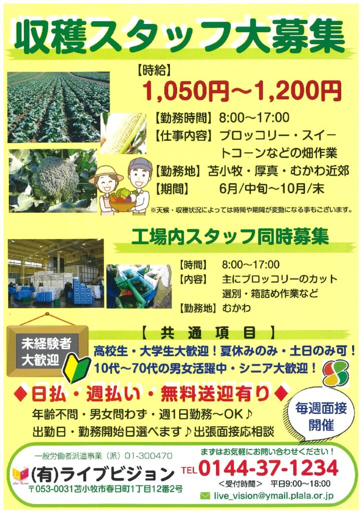収穫スタッフ大募集 【時給】1,010円~1,200円【勤務時間】8:00~17:00【仕事内容】畑でのブロッコリー、スイートコーン収穫作業【勤務地】苫小牧・厚真・むかわ近郊【期間】6月/中旬~11月/中旬※天候・収穫状況によっては時間や機関が変更になることも... -